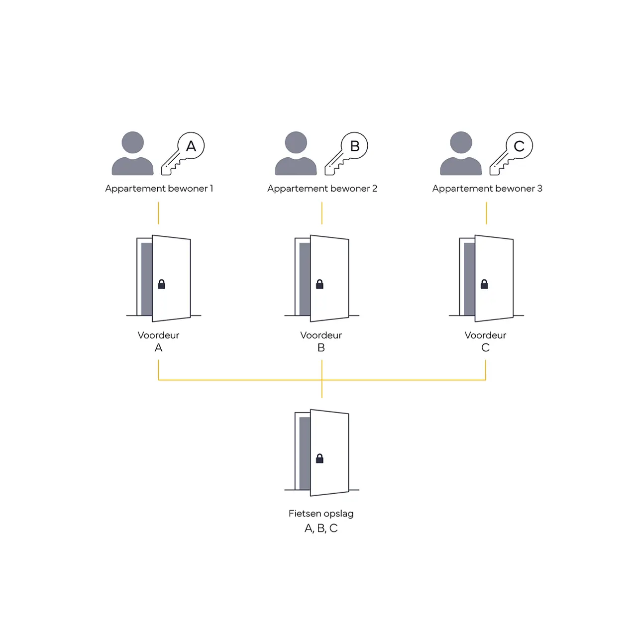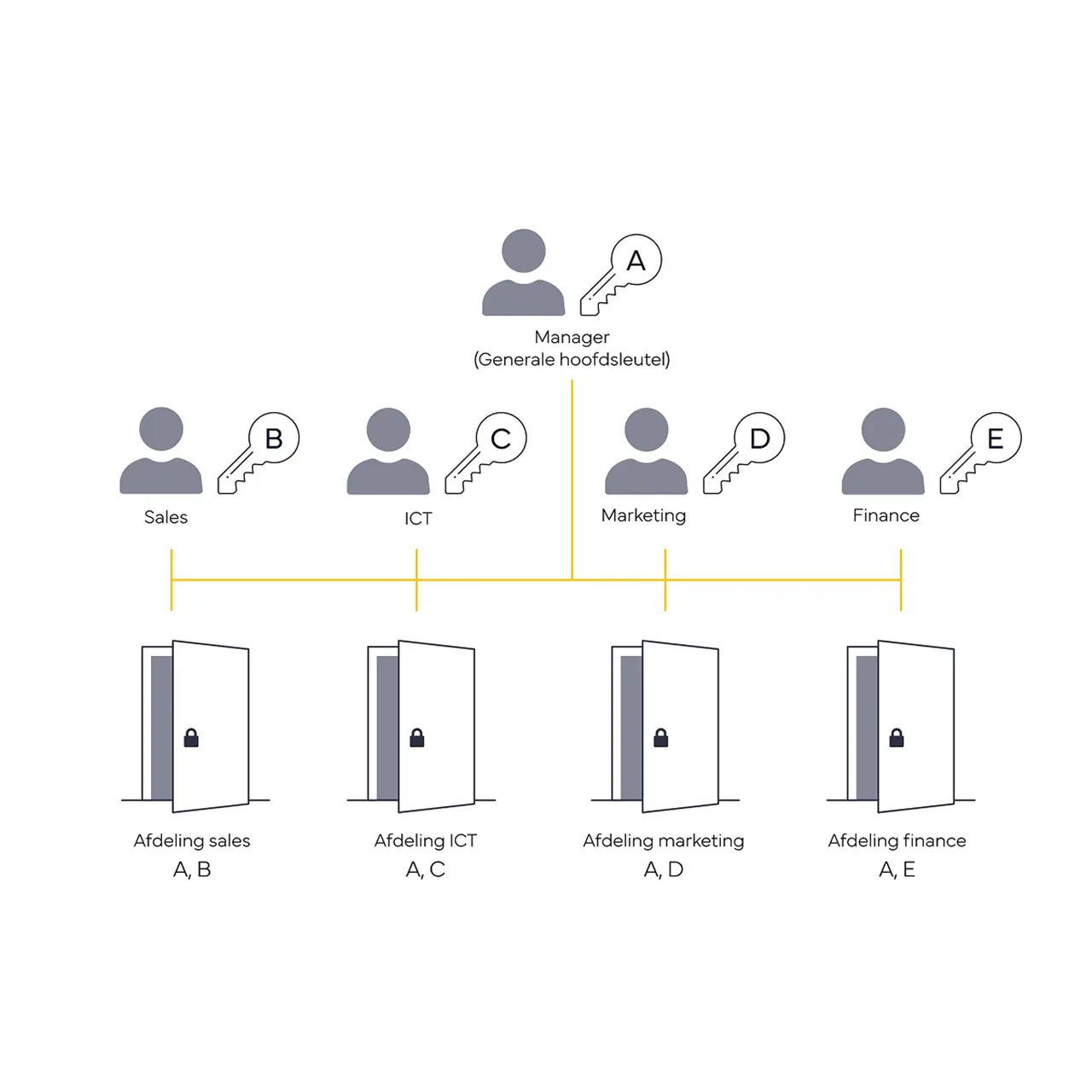Bij een hoofdsleutelsysteem kan een beheerder met één sleutel alle deuren openen, terwijl overige gebruikers alleen hun eigen deur kunnen openen. Handig voor onder meer wooncomplexen, scholen of sportfaciliteiten.